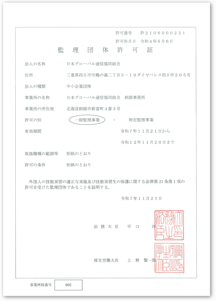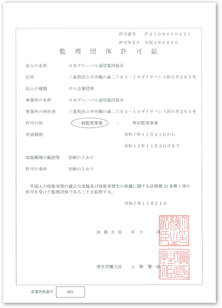 日本グローバル通信協同組合は、外国人の技能実習の適正な実施及び技能実習生の保護に関する法律第23条第1項の許可を受けた監理団体の証明を受けております。